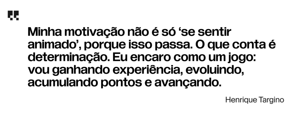 Mais do que motivação, Henrique acredita em consistência. “Minha motivação não é só ‘se sentir animado’, porque isso passa. O que conta é determinação. Eu encaro como um jogo: vou ganhando experiência, evoluindo, acumulando pontos e avançando.”