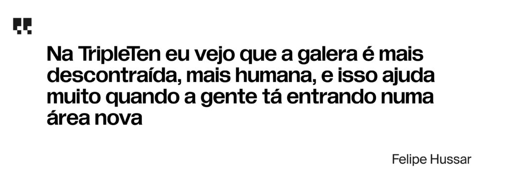 Outro ponto que marcou a experiência foi o networking. Mesmo sendo uma formação online, Felipe participou de encontros presenciais e fez contatos que influenciaram a busca por trabalho. Além disso, o ambiente do curso foi diferente do que ele estava acostumado. Diferentemente da universidade, a jornada da TripleTen apresentou a Felipe um espaço mais próximo e colaborativo, o que facilitou o aprendizado em uma área totalmente nova.