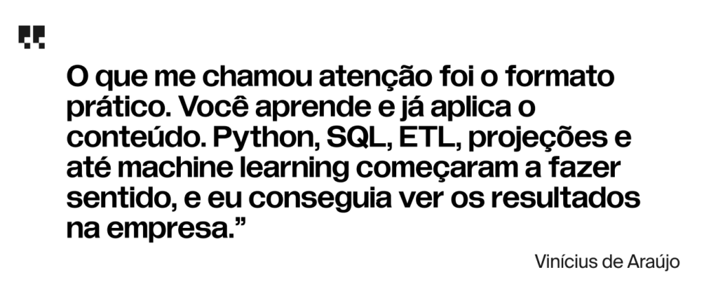 “O que me chamou atenção foi o formato prático. Você aprende e já aplica o conteúdo. Python, SQL, ETL, projeções e até machine learning começaram a fazer sentido, e eu conseguia ver os resultados na empresa”, relembra.