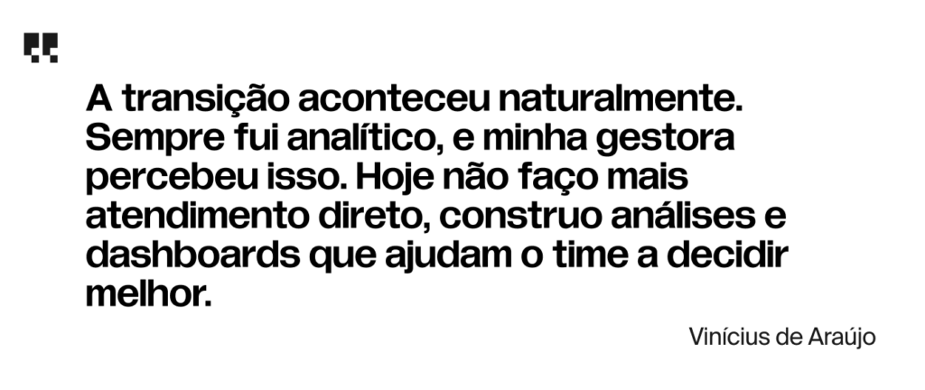 “A transição aconteceu naturalmente. Sempre fui analítico, e minha gestora percebeu isso. Hoje não faço mais atendimento direto, construo análises e dashboards que ajudam o time a decidir melhor”, diz.