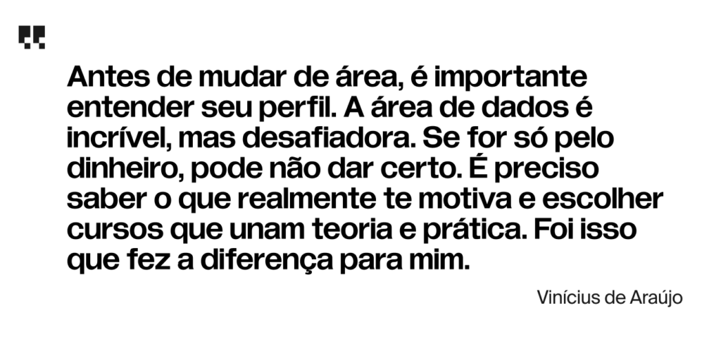 “Antes de mudar de área, é importante entender seu perfil. A área de dados é incrível, mas desafiadora. Se for só pelo dinheiro, pode não dar certo. É preciso saber o que realmente te motiva e escolher cursos que unam teoria e prática. Foi isso que fez a diferença para mim”, conclui.
