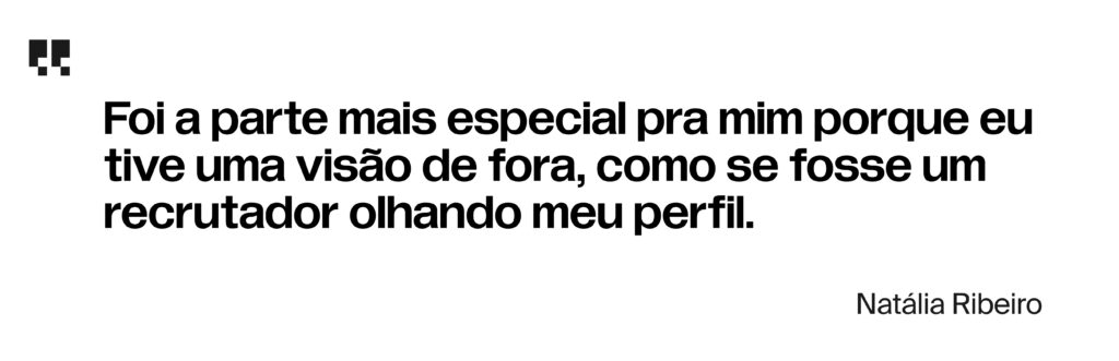 Até então, ela estava fazendo o que podia com o que sabia, mas faltava alguém para apontar o que funcionava, o que precisava melhorar e como o mercado enxerga o seu perfil. Como resultado, LinkedIn, portfólio e currículo foram ajustados com intenção, junto de uma confiança estrutural para que Natália sentisse estar no caminho certo.