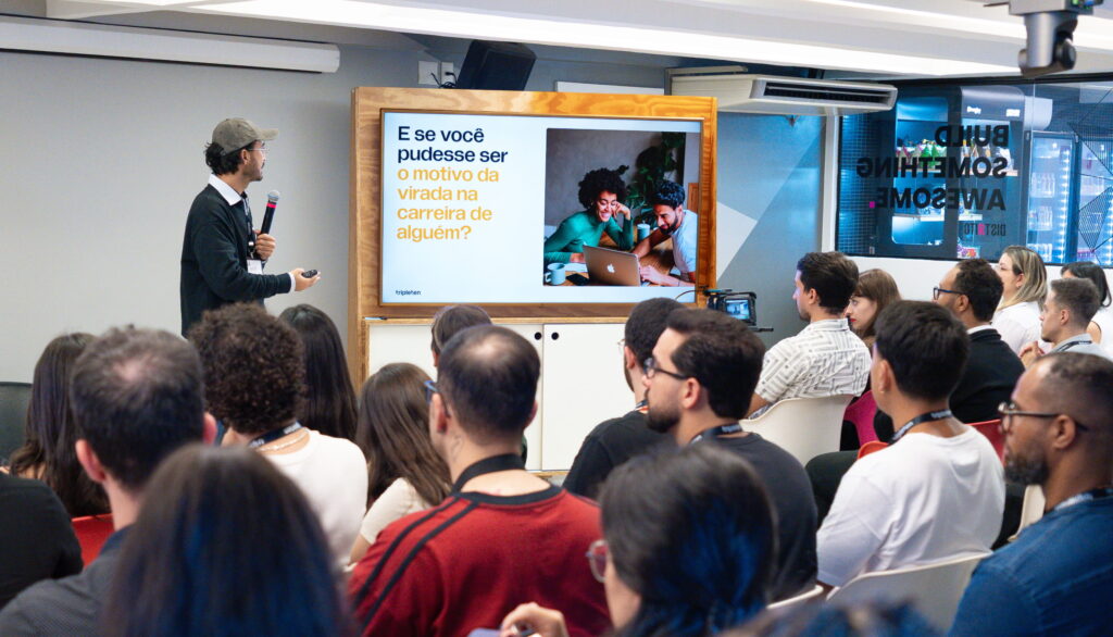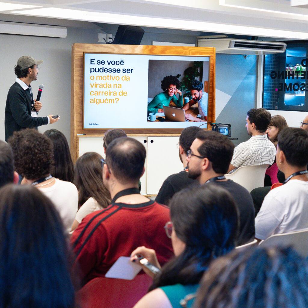 Criado para a comunidade TripleTen, o encontro foi um espaço de troca direta entre quem está estudando, quem já atua na área e quem vive, na prática, carreiras globais em tecnologia.