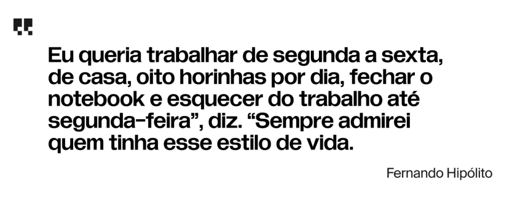 “Eu queria trabalhar de segunda a sexta, de casa, oito horinhas por dia, fechar o notebook e esquecer do trabalho até segunda-feira”, diz. “Sempre admirei quem tinha esse estilo de vida.”