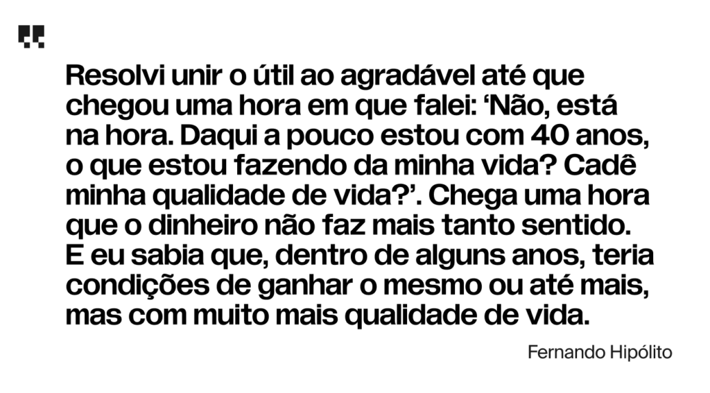 Foi então que veio o ponto de virada: “Resolvi unir o útil ao agradável até que chegou uma hora em que falei: ‘Não, está na hora. Daqui a pouco estou com 40 anos, o que estou fazendo da minha vida? Cadê minha qualidade de vida?’. Chega uma hora que o dinheiro não faz mais tanto sentido. E eu sabia que, dentro de alguns anos, teria condições de ganhar o mesmo ou até mais, mas com muito mais qualidade de vida.”