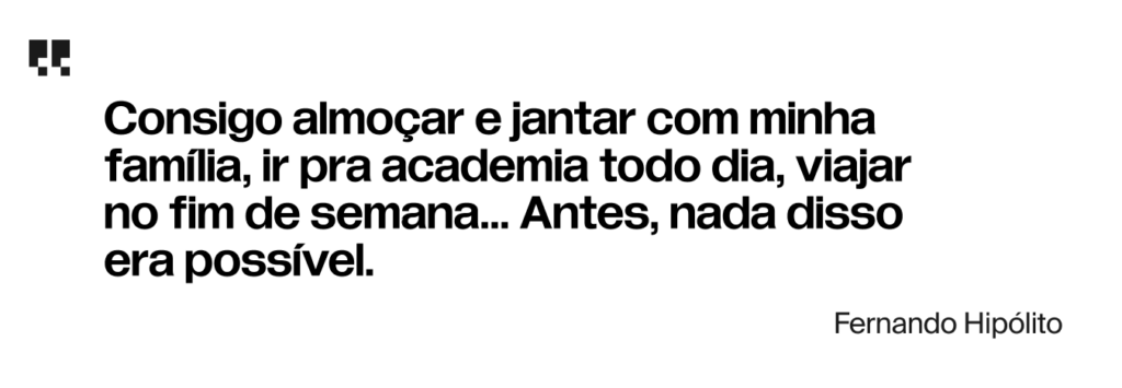 Hoje, Fernando trabalha em home office e finalmente tem a rotina que sonhava. “Consigo almoçar e jantar com minha família, ir pra academia todo dia, viajar no fim de semana… Antes, nada disso era possível.”