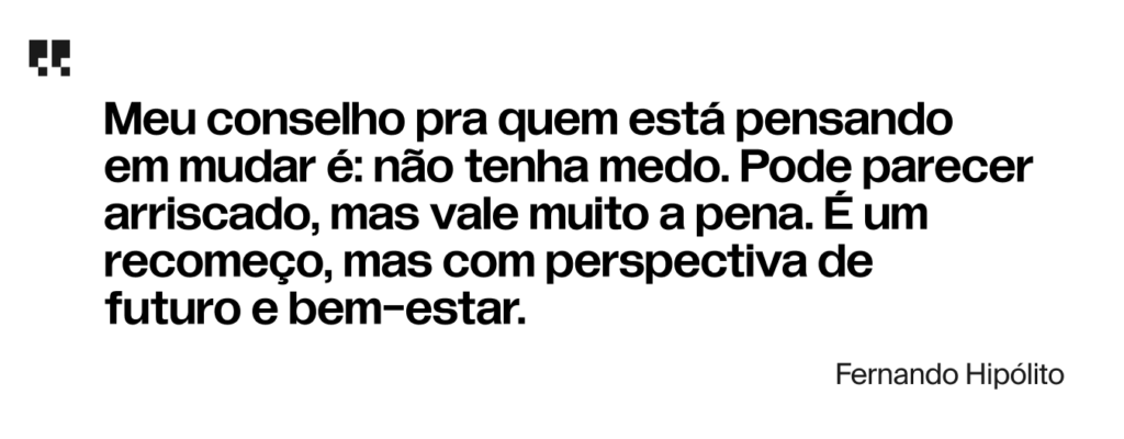 “Meu conselho pra quem está pensando em mudar é: não tenha medo. Pode parecer arriscado, mas vale muito a pena. É um recomeço, mas com perspectiva de futuro e bem-estar.”