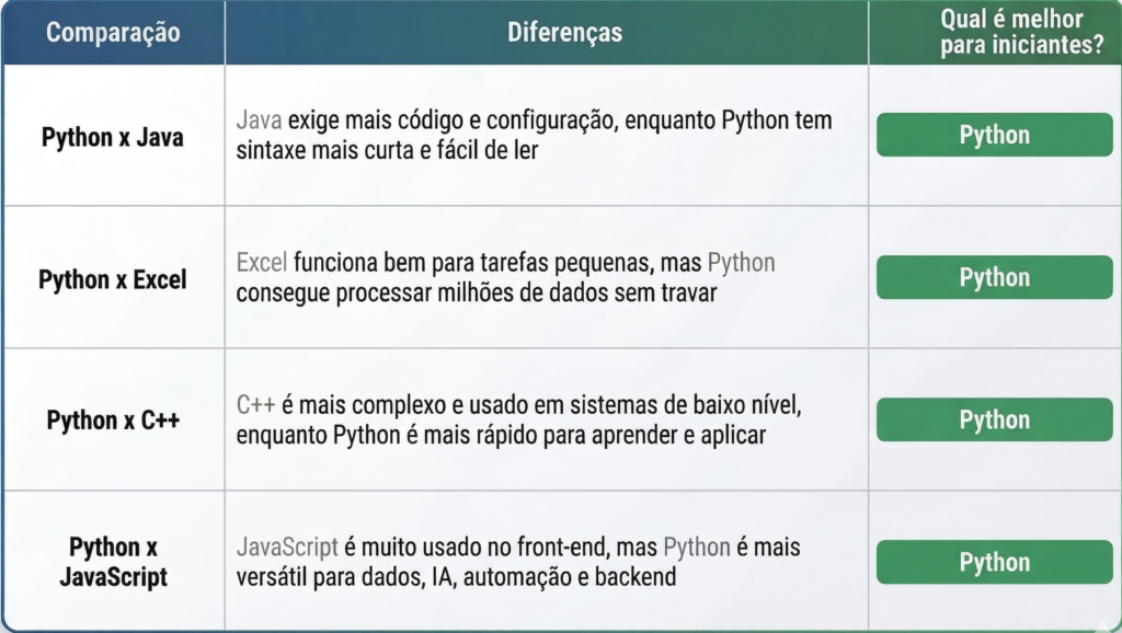 Existem muitas opções no mercado, como Java, C++, JavaScript e até ferramentas como Excel com VBA, mas Python costuma ser a escolha mais recomendada para iniciantes por causa da sua sintaxe simples, que exige menos linhas de código para criar programas e possui milhares de bibliotecas prontas para uso.