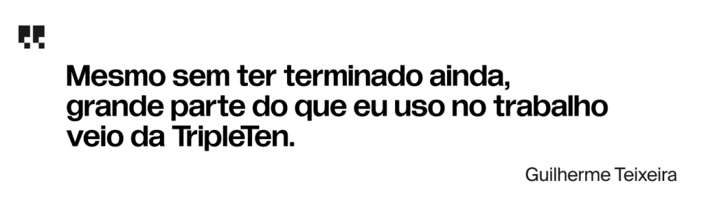 Guilherme ainda não concluiu o bootcamp. A rotina entre trabalho, faculdade e deslocamento atrasou o ritmo, mas ainda assim, o impacto é claro. “Mesmo sem ter terminado, grande parte do que eu uso no trabalho veio da TripleTen”, afirma.