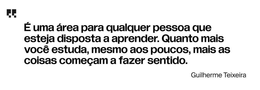 “É uma área para qualquer pessoa que esteja disposta a aprender”, ele completa. “Quanto mais você estuda, mesmo aos poucos, mais as coisas começam a fazer sentido.”